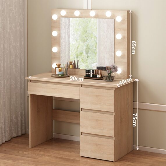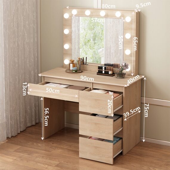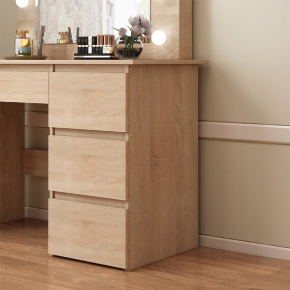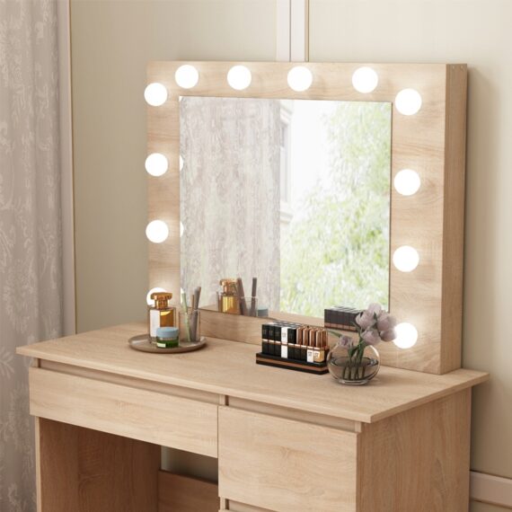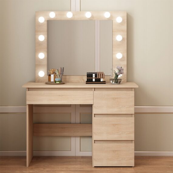 Vďaka štyrom priestranným zásuvkám si môžete jednoducho usporiadať kozmetiku, šperky a doplnky. Veľká pracovná doska poskytuje pohodlný priestor na každodenné používanie a LED osvetlenie vytvára dokonalé prostredie na nanášanie make-upu. Tento toaletný stolík sa bude hodiť nielen do spálne, ale aj do šatne alebo obývačky.
