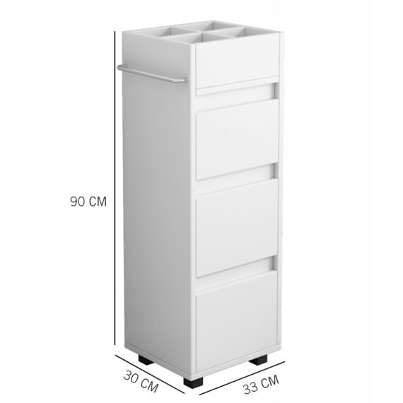 Táto biela kúpeľňová skrinka s rozmermi 33x30x90 cm je štýlovým a praktickým riešením, ktoré pomôže udržať poriadok v každej kúpeľni. Vďaka svojim kompaktným rozmerom je ideálna aj do malých priestorov a poskytuje pohodlné miesto na uloženie kozmetiky, čistiacich prostriedkov a ďalších nevyhnutných doplnkov.