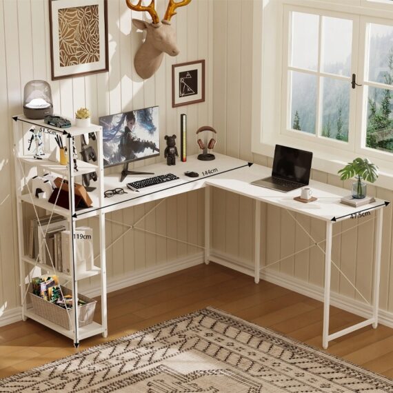 Rohový počítačový stôl s policami a knižnicou, biely, industriálny loftový štýl, 144 cm