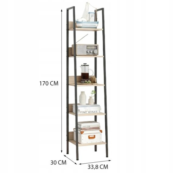 Priemyselná vysoká stojaca knižnica, svetlo hnedá, 5 políc, rebríkový štýl