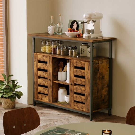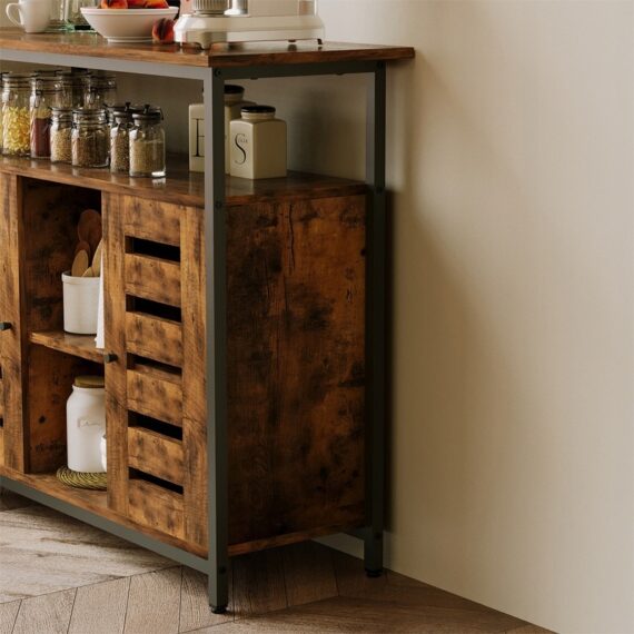 Komoda s otvorenými policami, hnedá komoda, retro kuchyňa v štýle loft