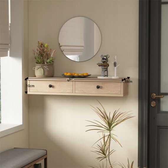 Štýlová závesná polica so zásuvkami v svetlo hnedom prevedení je praktickým a estetickým riešením pre moderné interiéry. Je ideálna ako funkčná nástenná skrinka, ktorá ponúka priestor na odkladanie a vystavenie dekorácií.