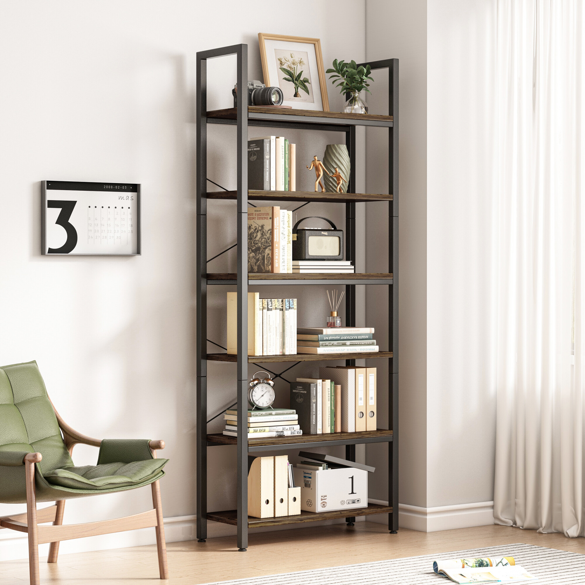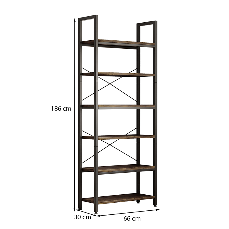 Knižnica zaujme kombináciou prírodných odtieňov svetlohnedého dreva so staršou povrchovou úpravou a pevného matného čierneho kovového rámu. Otvorená konštrukcia s krížovými podperami na zadnej strane dodáva štýlový, loftový dojem a zároveň poskytuje stabilitu.