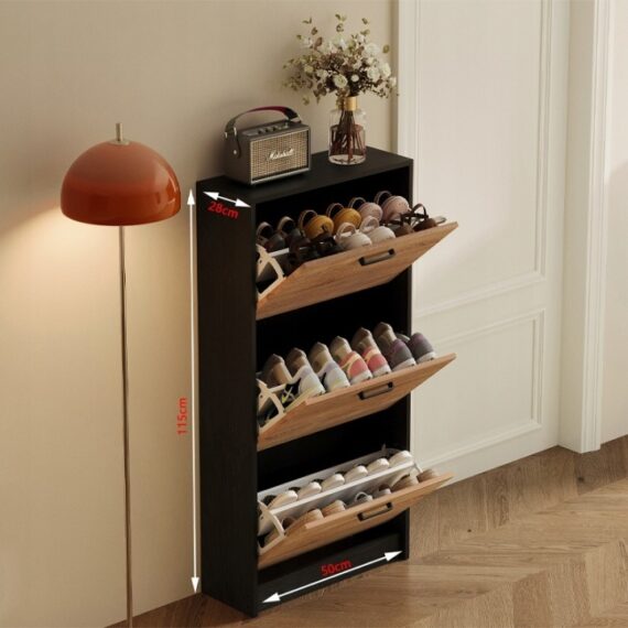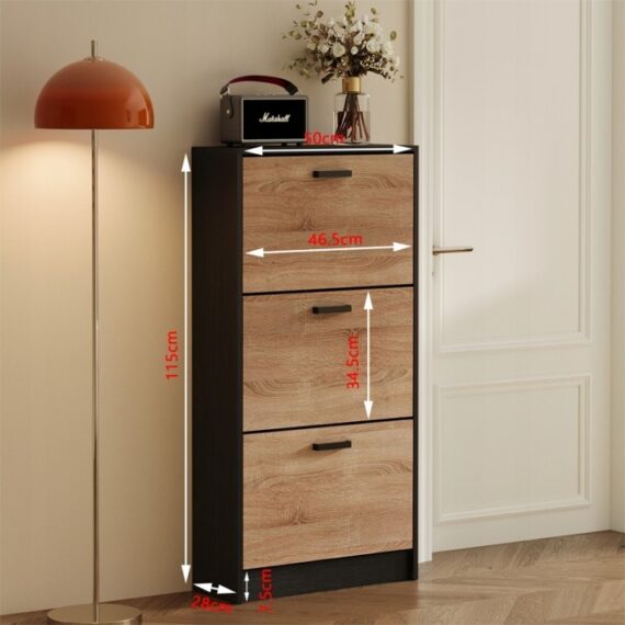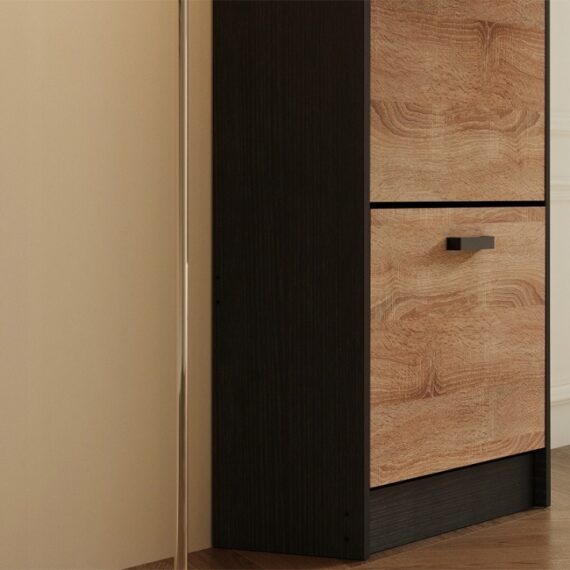 Táto funkčná a štýlová svetlohnedá skrinka na topánky je perfektným riešením do chodby alebo na chodbu. Vďaka výklopnému úložnému systému a trom priestranným policiam vám umožňuje pohodlne usporiadať topánky a zároveň zaberať minimálny priestor.