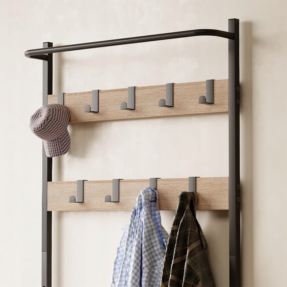 Ideálny do predsiene, spálne, šatne alebo kancelárie – vešiak na kabáty sa hodí všade tam, kde je potrebný funkčný priestor na odkladanie oblečenia a topánok.