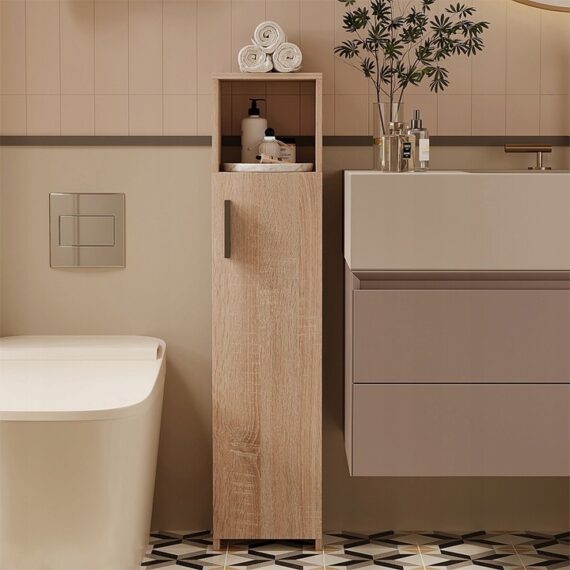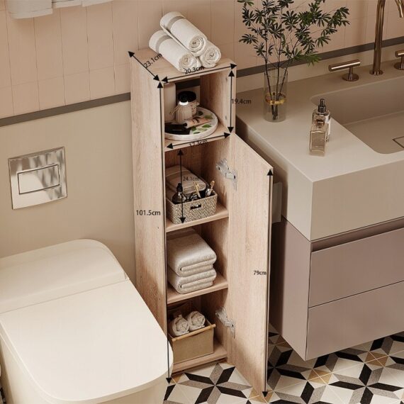 Moderná a funkčná svetlo hnedá stĺpová kúpeľňová skrinka je praktickým riešením pre malé a stredne veľké kúpeľne. Jej štíhly dizajn umožňuje optimálne využitie priestoru a ponúka pohodlné úložné priestory.