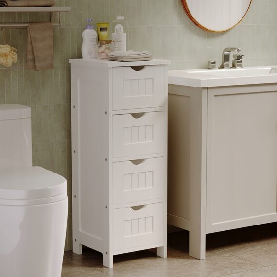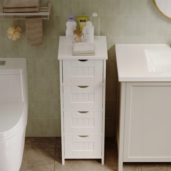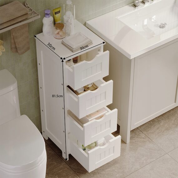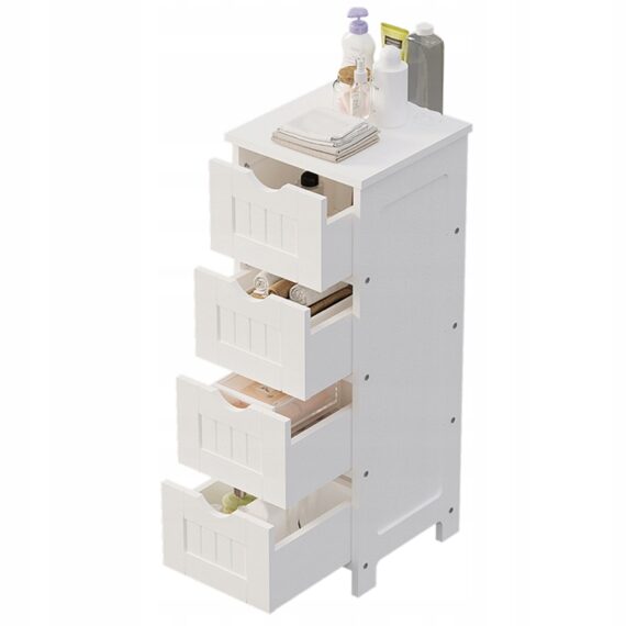 Vďaka štyrom praktickým zásuvkám si môžete jednoducho usporiadať kozmetiku, čistiace prostriedky a kúpeľňové doplnky. Úzky dizajn vám umožňuje maximalizovať priestor aj v malej kúpeľni a poskytuje pohodlný prístup ku všetkým potrebným veciam.